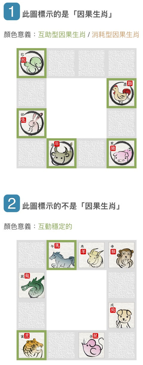 以她的命格來說,雞、豬、牛、兔、蛇都是因果生肖,也同時是好的因果生肖(幸運),只要取上面的正緣生肖與因果生肖做「交集」,就可以找到好的正緣生肖。其次,如果不是因果生肖,卻是互動穩定的(下方第二部分),交集正緣生肖,也是好的選擇。