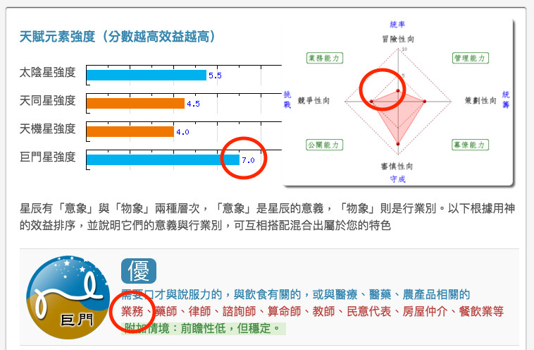 四象圖顯示業務能力不好,但職業用神星為巨門,而巨門有個說明是「業務」