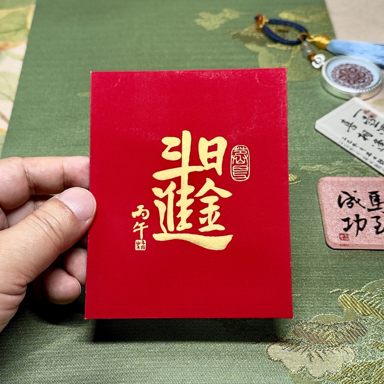 為了跟「黃金萬兩」統一字形長寬,今年的日進斗金換了一種寫法,稍微長型一點,「斗」與「進」共用豎劃,直接進斗,意境好!