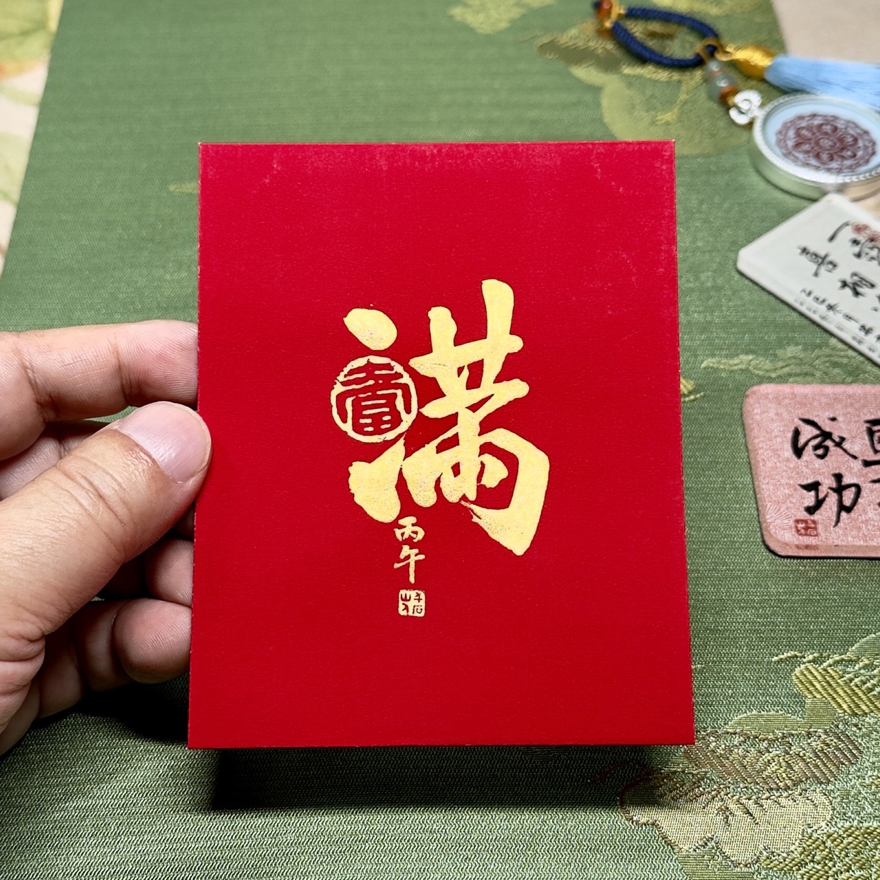 - 紅包袋用金墨書寫、印章貼純金金箔,純手工製作,今年多了 袖珍版 9.5x12 cm 可選購,適合放聚寶盆、收藏、贈禮。