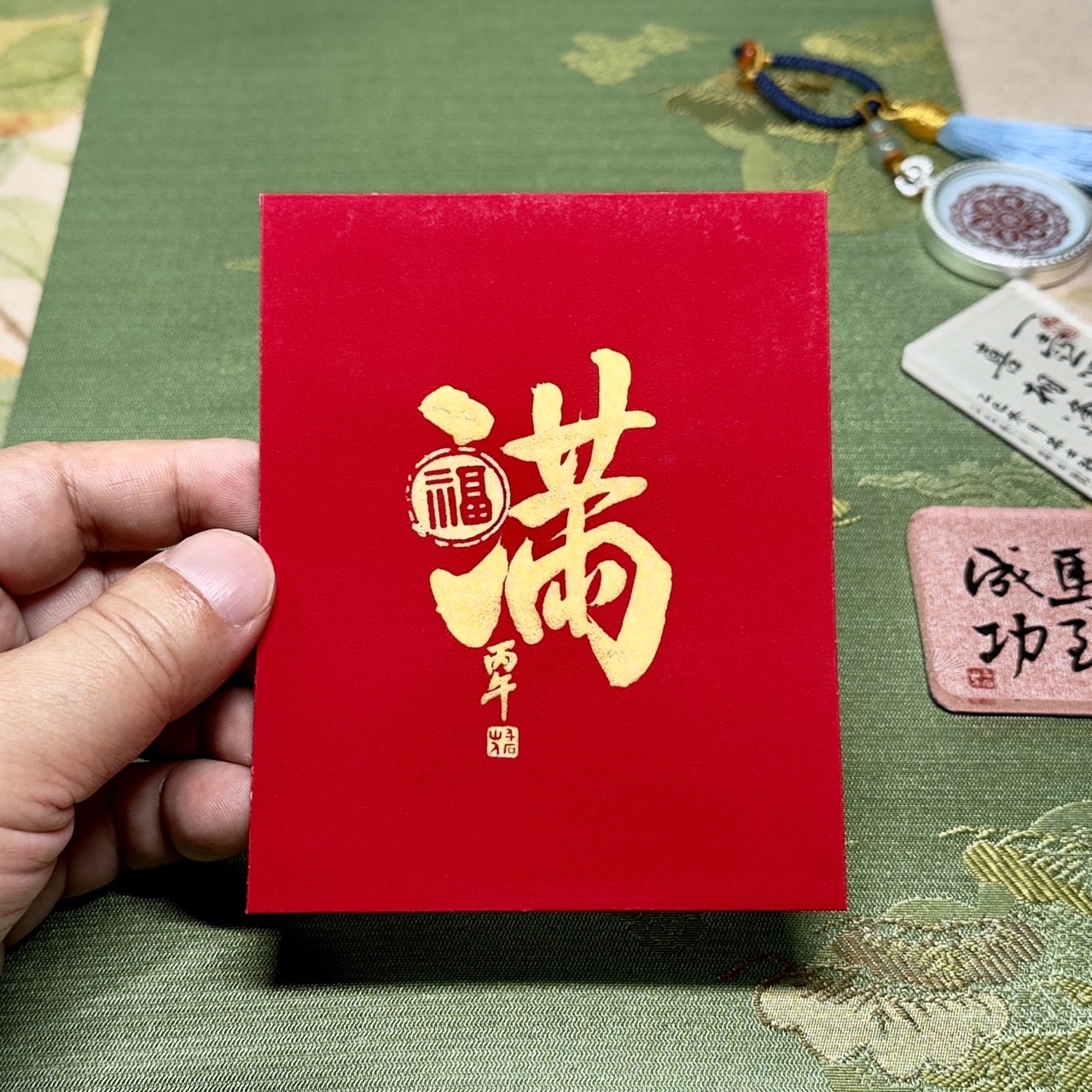 - 紅包袋用金墨書寫、印章貼純金金箔,純手工製作,今年多了 袖珍版 9.5x12 cm 可選購,適合放聚寶盆、收藏、贈禮。
